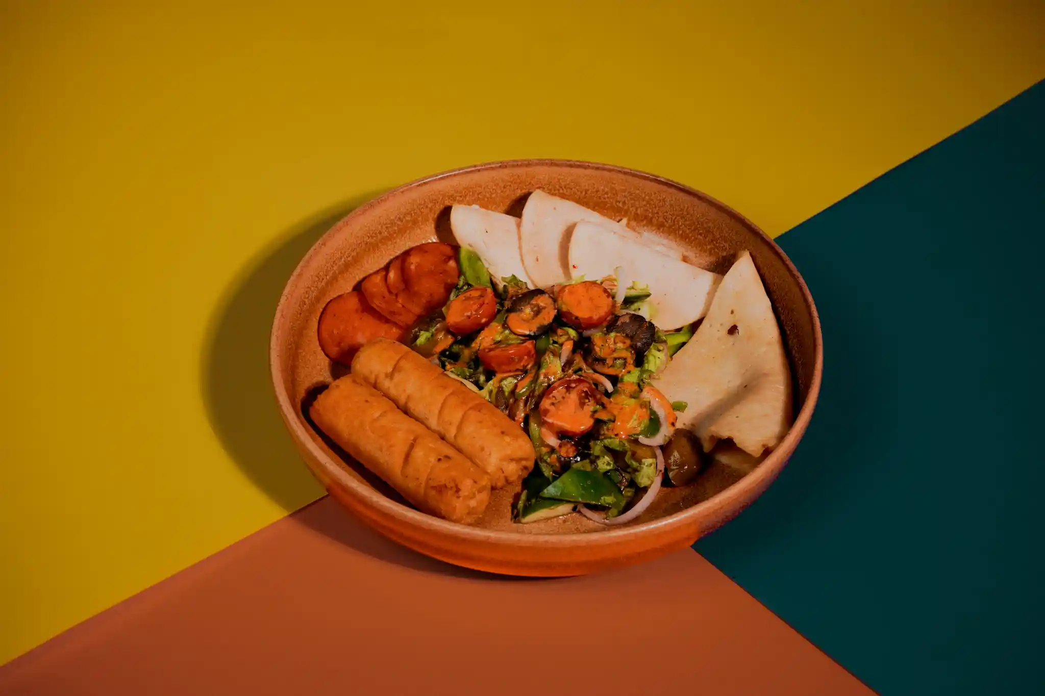 Tortilla topped with onion, potato, green peppers, and spiced meat, fried egg and a drizzle of spicy mayo Veg / Chicken / Pork / Buff