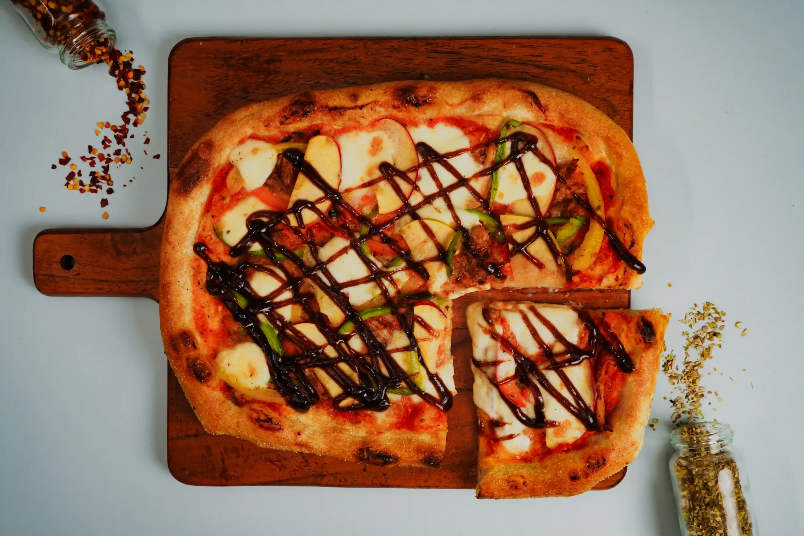 2 baked eggs, choice of meat (below) layered on a spicy masala of mushrooms, capsicum, onions and tomato topped with cheese and coriander Pick one: Chicken Sausage / Chicken Salami / Chicken Ham / Chicken Pepperoni / Smoked Bacon / Pork Pepperoni / Pork Pepper Sausage / Pork Ham