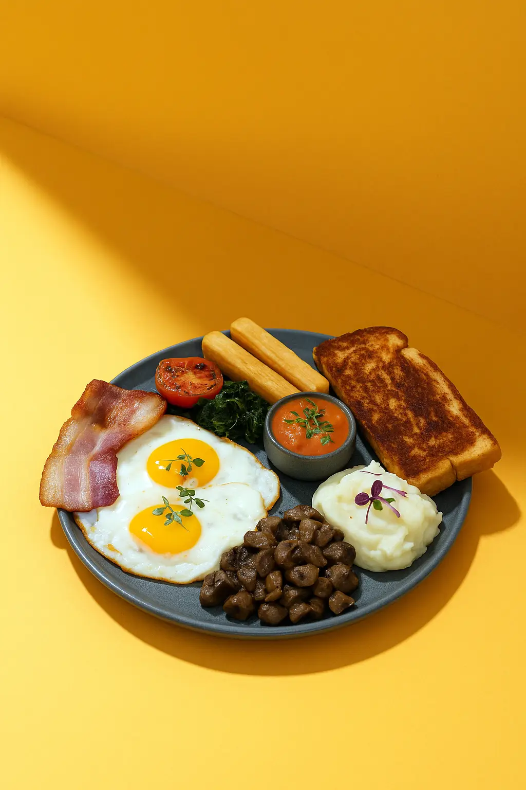 Chicken Sausages (2), Bacon (pork), 2 Fried Eggs, Baked Beans, Sautéed Mushrooms, Mashed potato & grilled spinach tomato.